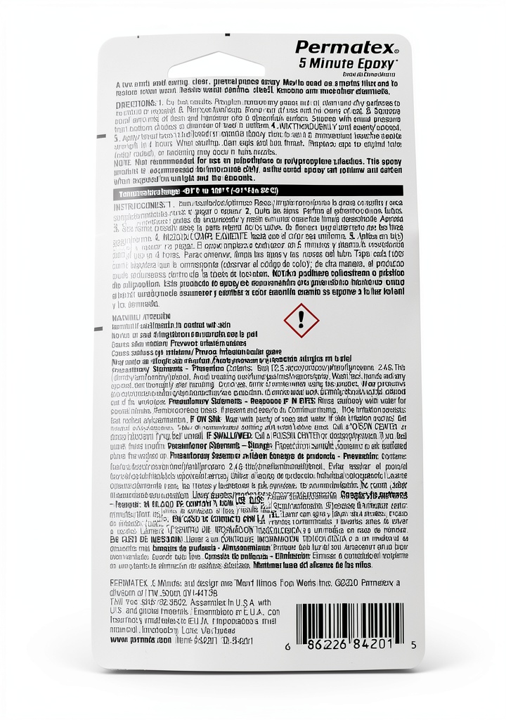 Permatex 84201 stands out due to its versatility and ease of use, backed by the trusted Permatex brand known for quality automotive products. The two-part system ensures consistent performance and strong adhesion, while the no-clamp setup in just five minutes saves time and effort. Its water resistance and high tensile strength provide long-lasting durability, making it a cost-effective alternative to more complex repair methods. With a focus on reliability and broad material compatibility, this epoxy offers a competitive edge for both professional and casual users seeking dependable results.