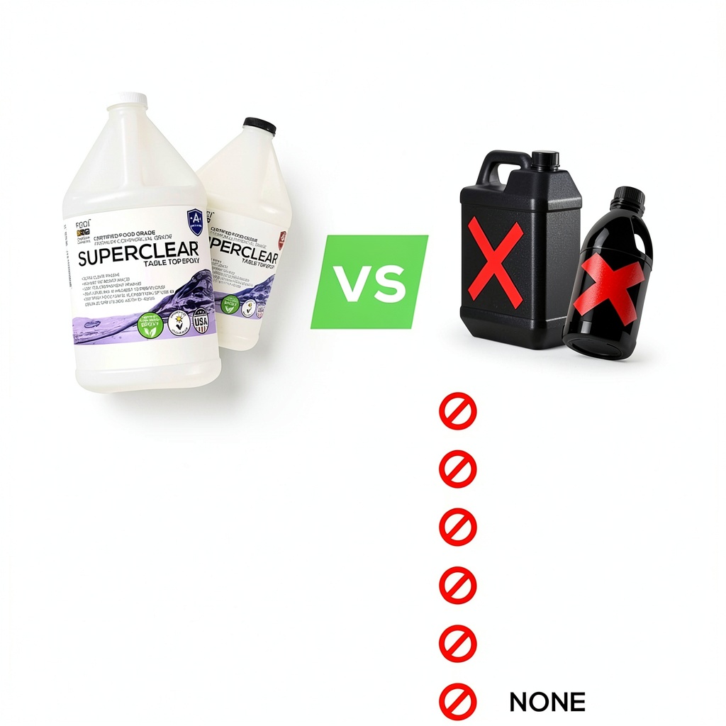 Superclear Epoxy Resin stands out due to its superior UV resistance, preventing yellowing and maintaining clarity over time. It is independently tested and certified food safe after curing, complying with 21 CFR 175.300 and ASTM D-4236 standards. Proudly made in Saint Petersburg, FL, by Fiberglass Coatings with over 60 years of experience, it guarantees quality, impact resistance, and seamless color integration with pigments and inks.